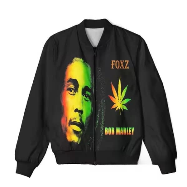 Show off your reggae roots in style with this bold Bob Marley bomber jacket featuring a striking portrait in iconic Rasta colors. A vivid gradient of green, yellow, and red lights up Marley’s face, accompanied by a matching cannabis leaf design that celebrates the spirit of freedom, unity, and peace that Marley championed.