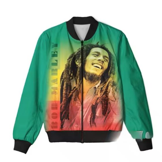 Capture the soul of reggae and the power of positivity with this vibrant Bob Marley bomber jacket, featuring a joyful portrait washed in iconic Rasta colors. Set against a bright green base, the radiant image of Marley smiling and the bold vertical name print embody pure energy, love, and freedom. Perfect for fans who want to spread good vibes everywhere they go.